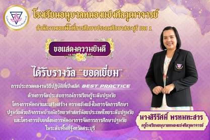 ชื่อผลงาน : ได้รับ รางวัล “ยอดเยี่ยม” จากการประกวดผลงานวิธีปฏิบัติที่เป็นเลิศ (Best Practice) ด้านการจัดประสบการณ์การเรียนรู้ระดับปฐมวัย