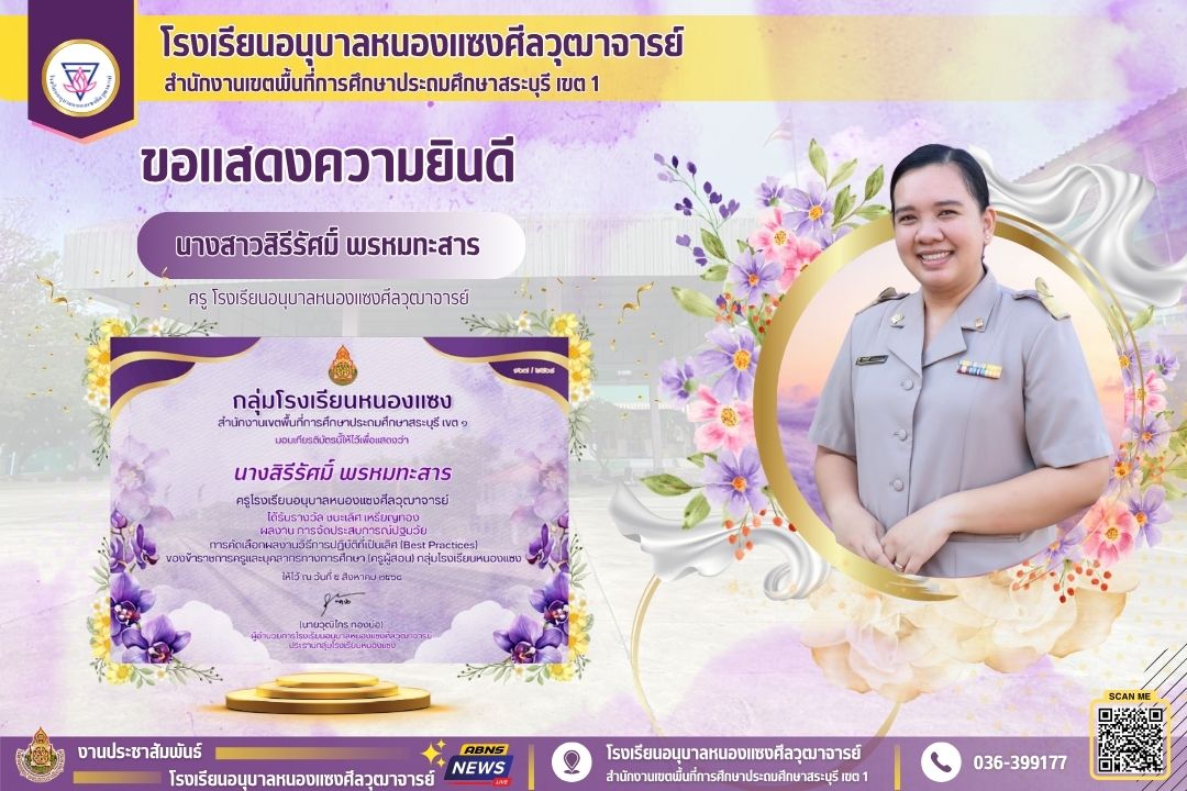 ได้รับรางวัล ชนะเลิศ เหรียญทองจากการคัดเลือก วิธีปฏิบัติที่เป็นเลิศ (Best Practices) ของข้าราชการครูและบุคลากรทางการศึกษา (ครูผู้สอน) กลุ่มโรงเรียนหนองแซง ประจำปี 2568 ผลงาน : การจัดประสบการณ์ปฐมวัย |