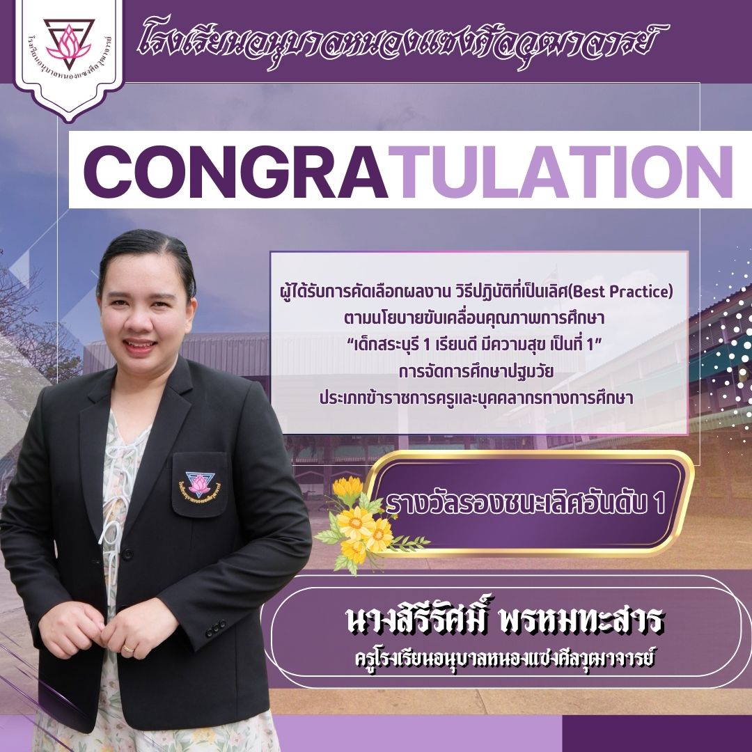 ได้รับ รางวัลรองชนะเลิศ อันดับ 1 ผลงาน วิธีปฏิบัติที่เป็นเลิศ (Best Practice) ตามนโยบายขับเคลื่อนคุณภาพการศึกษา “เด็กสระบุรี 1 เรียนดี มีความสุข เป็นที่ 1” ด้าน การจัดการศึกษาปฐมวัย ประเภท ข้าราชการครูและบุคลากรทางการศึกษา |