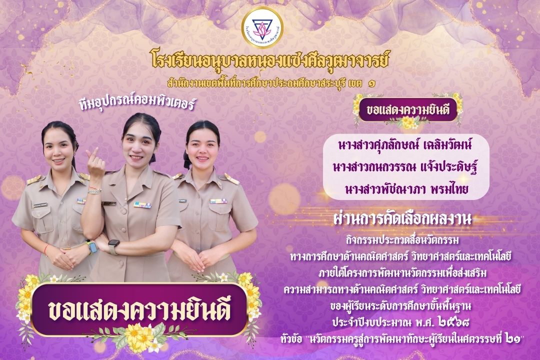 ผ่านการคัดเลือกผลงาน กิจกรรมประกวดสื่อนวัตกรรมทางการศึกษาด้านคณิตศาสตร์ วิทยาศาสตร์และเทคโนโลยี ภายใต้โครงการพัฒนานวัตกรรมเพื่อส่งเสริมความสามารถทางด้านคณิตศาสตร์ วิทยาศาสตร์และเทคโนโลยี ของผู้เรียนระดับการศึกษาขั้นพื้นฐาน ประจำปีงบประมาณ พ.ศ. 2568 ในหัวข้อ "นวัตกรรมครูสู่การพัฒนาทักษะผู้เรียนในศตวรรษที่ 21" ทีมอุปกรณ์คอมพิวเตอร์ |