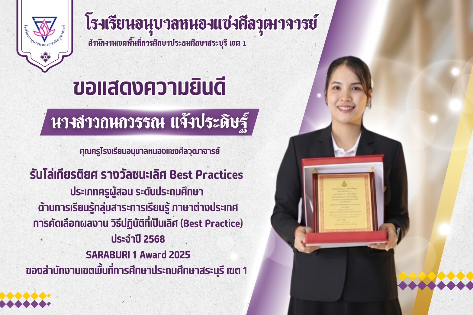 ได้รับโล่เกียรติยศ รางวัลชนะเลิศ Best Practices ประเภทครูผู้สอน ระดับประถมศึกษา
