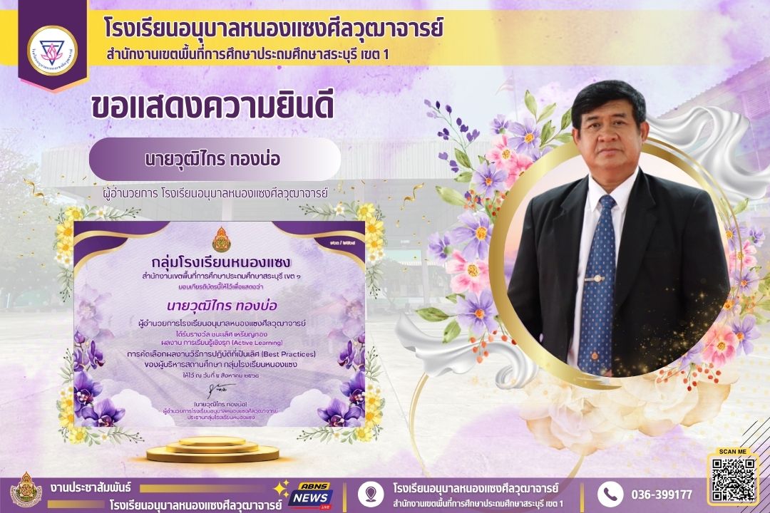 ชื่อผลงาน : รางวัลชนะเลิศ เหรียญทองทผลงาน “การเรียนรู้เชิงรุก (Active Learning)”จากการคัดเลือก วิธีปฏิบัติที่เป็นเลิศ (Best Practices) ของผู้บริหารสถานศึกษา