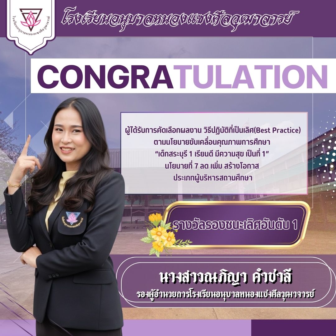 ได้รับ รางวัลรองชนะเลิศ อันดับ 1 ผลงาน วิธีปฏิบัติที่เป็นเลิศ (Best Practice) ตามนโยบายขับเคลื่อนคุณภาพการศึกษา “เด็กสระบุรี 1 เรียนดี มีความสุข เป็นที่ 1” นโยบายที่ 7 : ลด เพิ่ม สร้างโอกาส ประเภท ผู้บริหารสถานศึกษา |